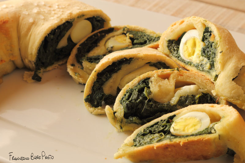 Salate leggermente e arrotolate tutto chiudendo la pasta ai lati e disponendola a mò di ciambella. Oleate la superficie e cospargete di sale grosso.