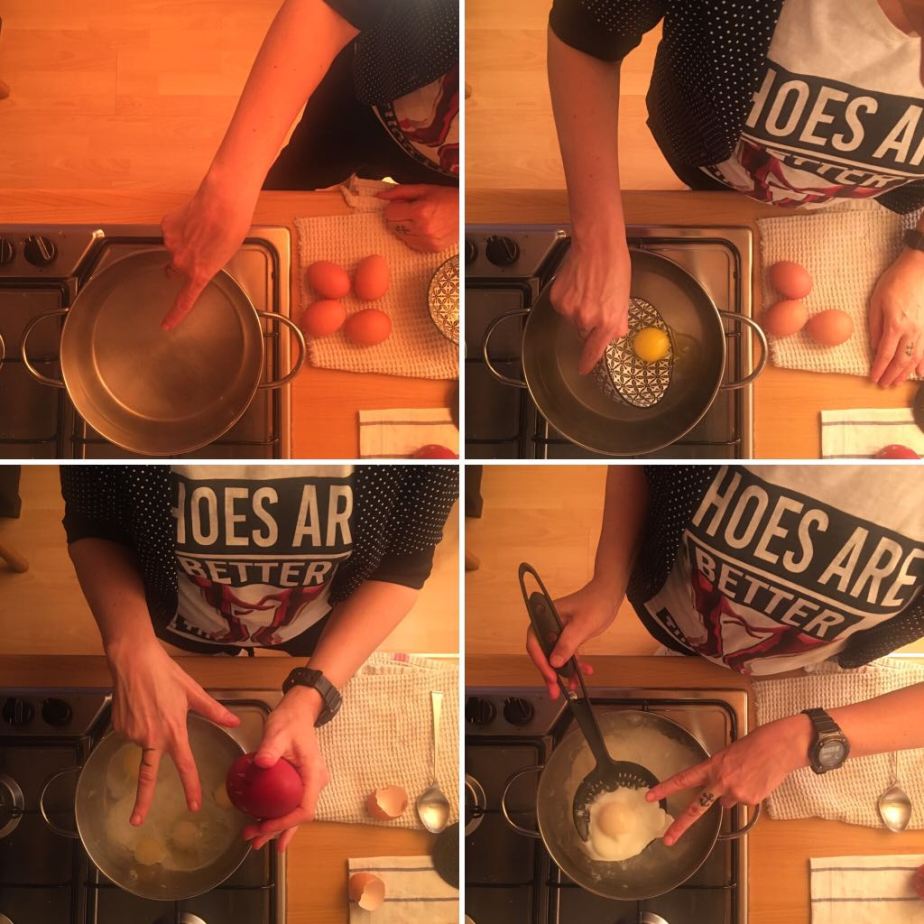 E poi tutti i consigli inutili: devi creare un vortice nell’acqua, ma attento, solo in senso orario! Devi mettere un cucchiaino di aceto, l’aceto si ma solo di mele, anzi funziona solo se è bianco. E  un pizzico di sale, grosso, anzi no, fino. E il tegame mi raccomando, basso e anti aderente. Ma cosa dici? deve essere di acciaio. E cosa? no, no, devi per forza cuocere un uovo alla volta sennò si scatena la maledizione dell’uovo mannaro e vengono tutti male!